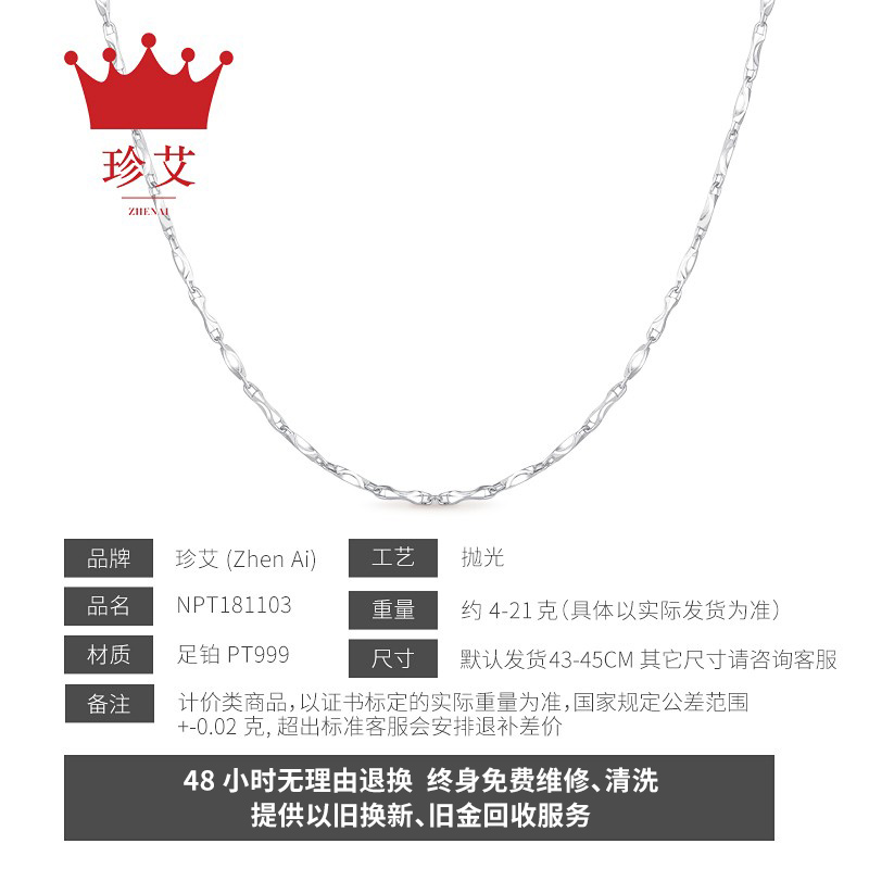PT999 Platinum 4.33g (41cm) PT999 Platinum 5.36g (43cm) PT999 Platinum 5.57g (45cm) PT999 Platinum 6.34g (42cm) PT999 Platinum 6.56g (45cm) PT999 Platinum 6.87g (48cm) PT999 Platinum 7.42g (45cm) PT999 Platinum 7.83g (48cm) PT999 Platinum 8.28g (45cm) PT999 Platinum 8.89g (48cm) PT999 Platinum 9.43g (45cm) PT999 Platinum 9.85g (48cm) PT999 Platinum 10.9g (48cm) PT999 Platinum 11.01g (48cm) PT999 Platinum 11.43g (50cm) PT999 Platinum 13.67g (47cm) PT999 Platinum Approx. 14.50g (Next Order) PT999 Platinum 18.54 g (48 cm) The distribution order is subject to the actual distribution weight, and more refunds are less
