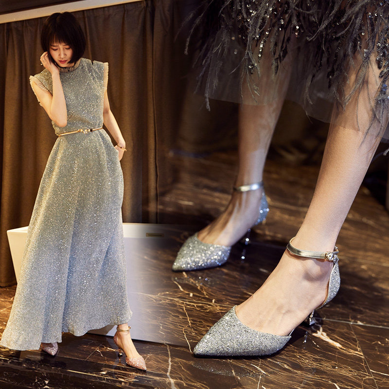 Silver high heels female fairy style wedding shoes wedding dress Xiuhe two wear bride princess one word buckle small size low heel shoes