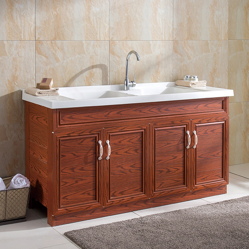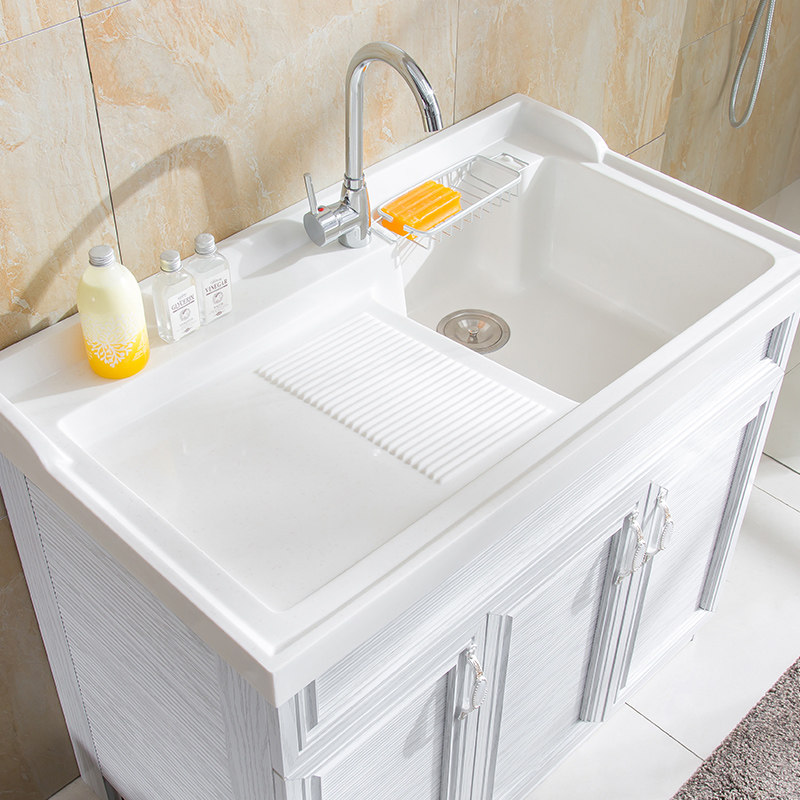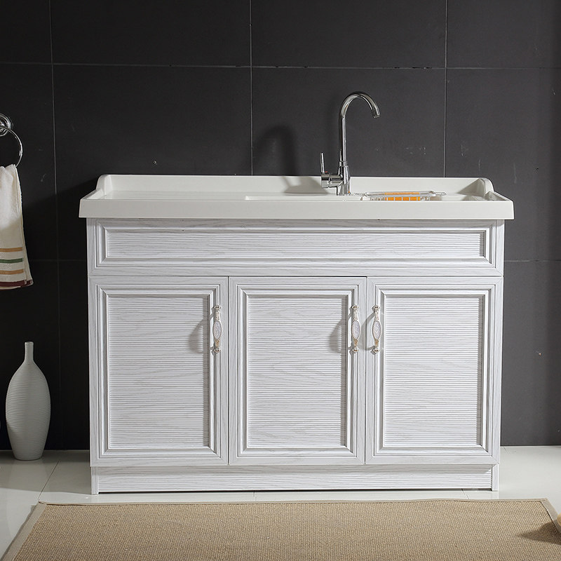 Custom-cut corner space aluminum laundry cabinet balcony with washboard quartz stone integrated countertop small apartment floor-to-ceiling laundry pool
