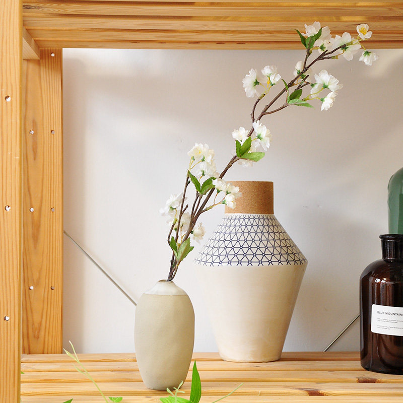White cherry blossom and coarse pottery small bottle of willow branches and coarse pottery vial