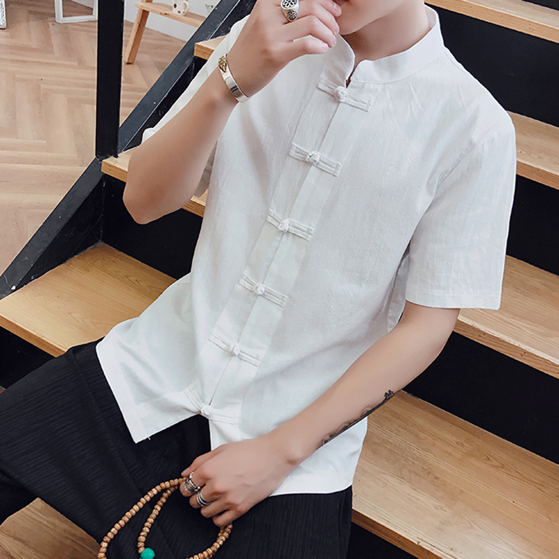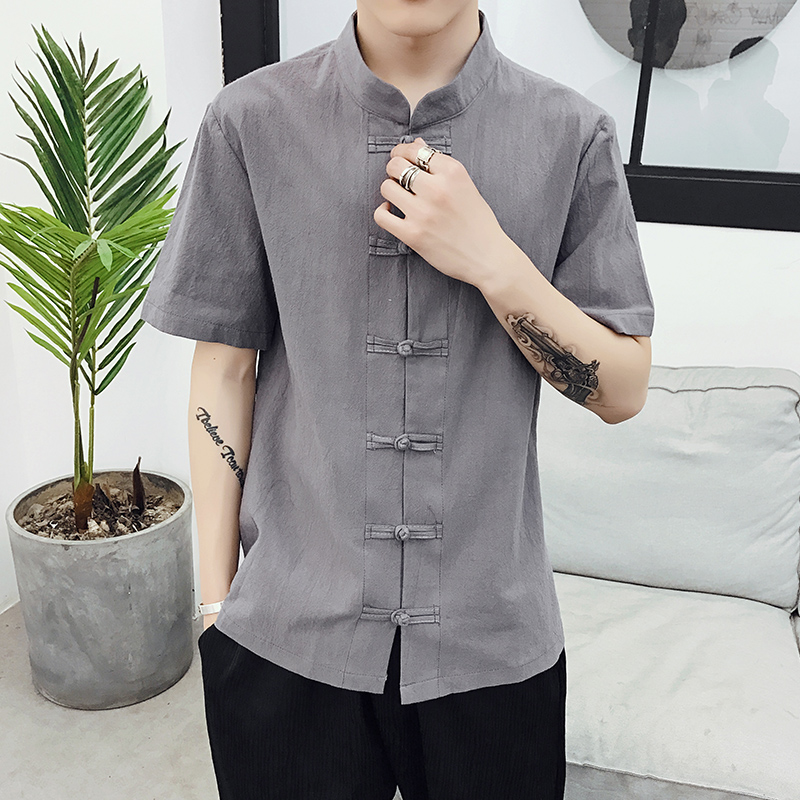 Chinese style men's summer large size plate button stand collar linen shirt men's short-sleeved Tang suit Chinese half-sleeve cotton and linen shirt