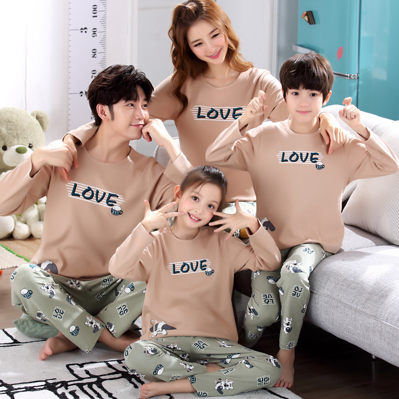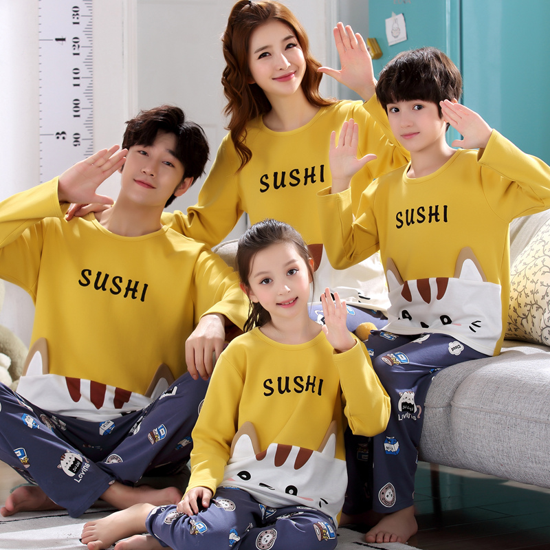 Parent-child Sleepwear Long Sleeve Pure Cotton Family of three Spring and Autumn Season Boy girls Mother women's clothing All cotton Home Household Clothing Suit