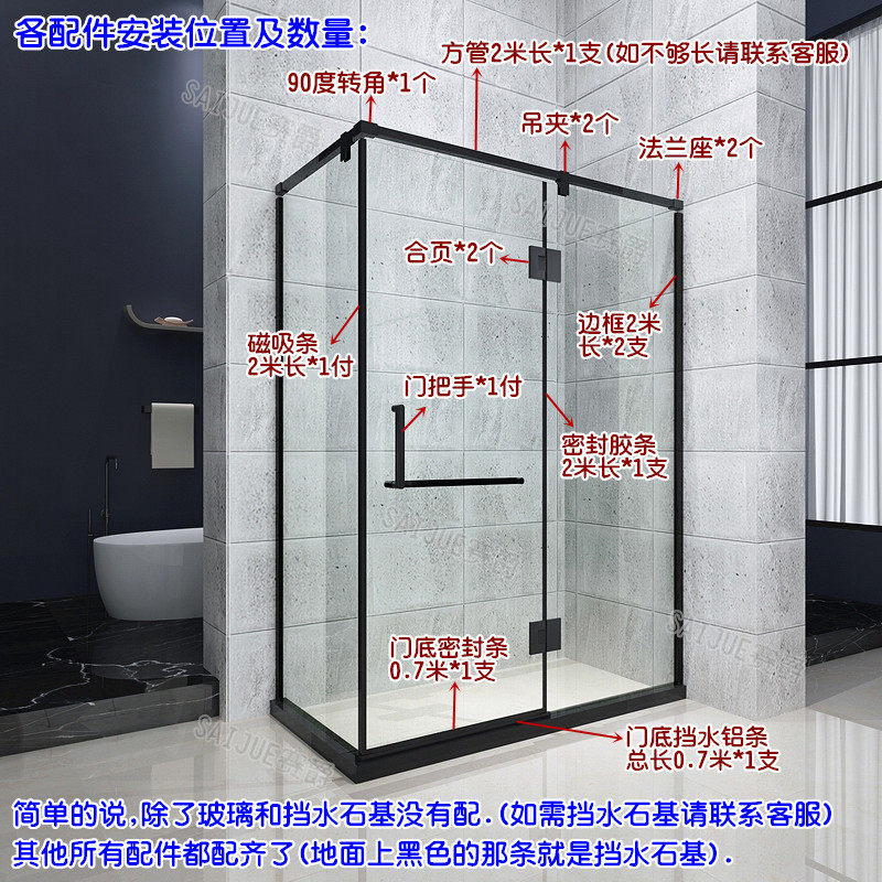 Matte black 304 stainless steel square L-shaped seven 7 shape shower room bathroom glass partition hardware accessories set