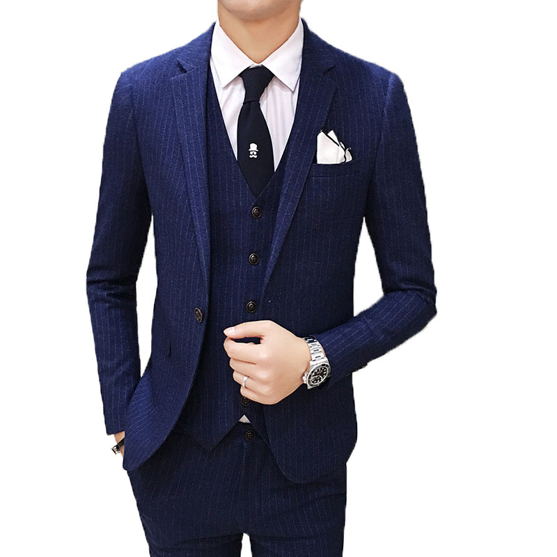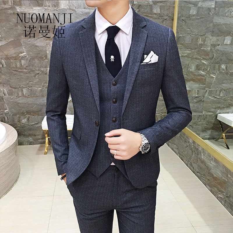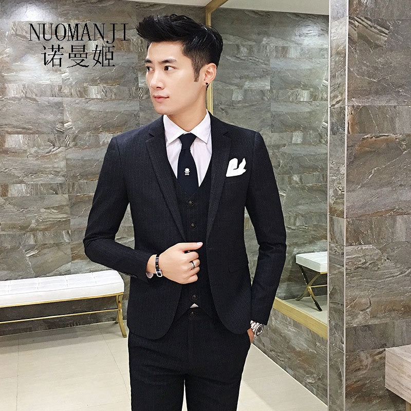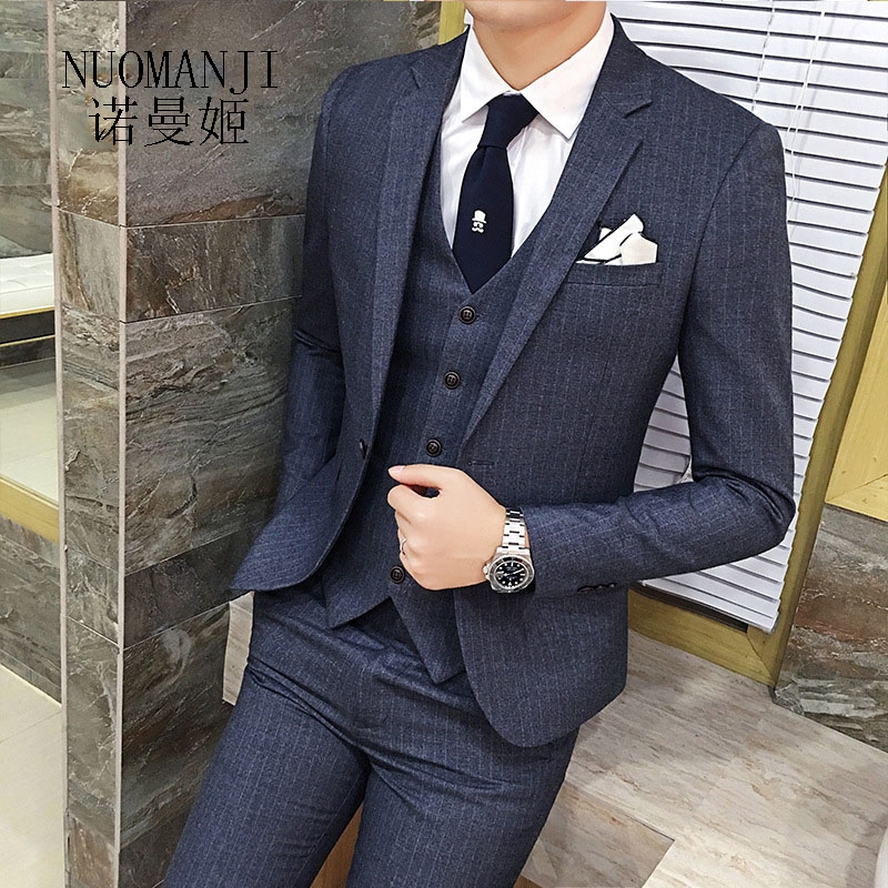 Norman Ji's new men's suit suit three-piece striped slim fit OL overalls groom wedding suit tide