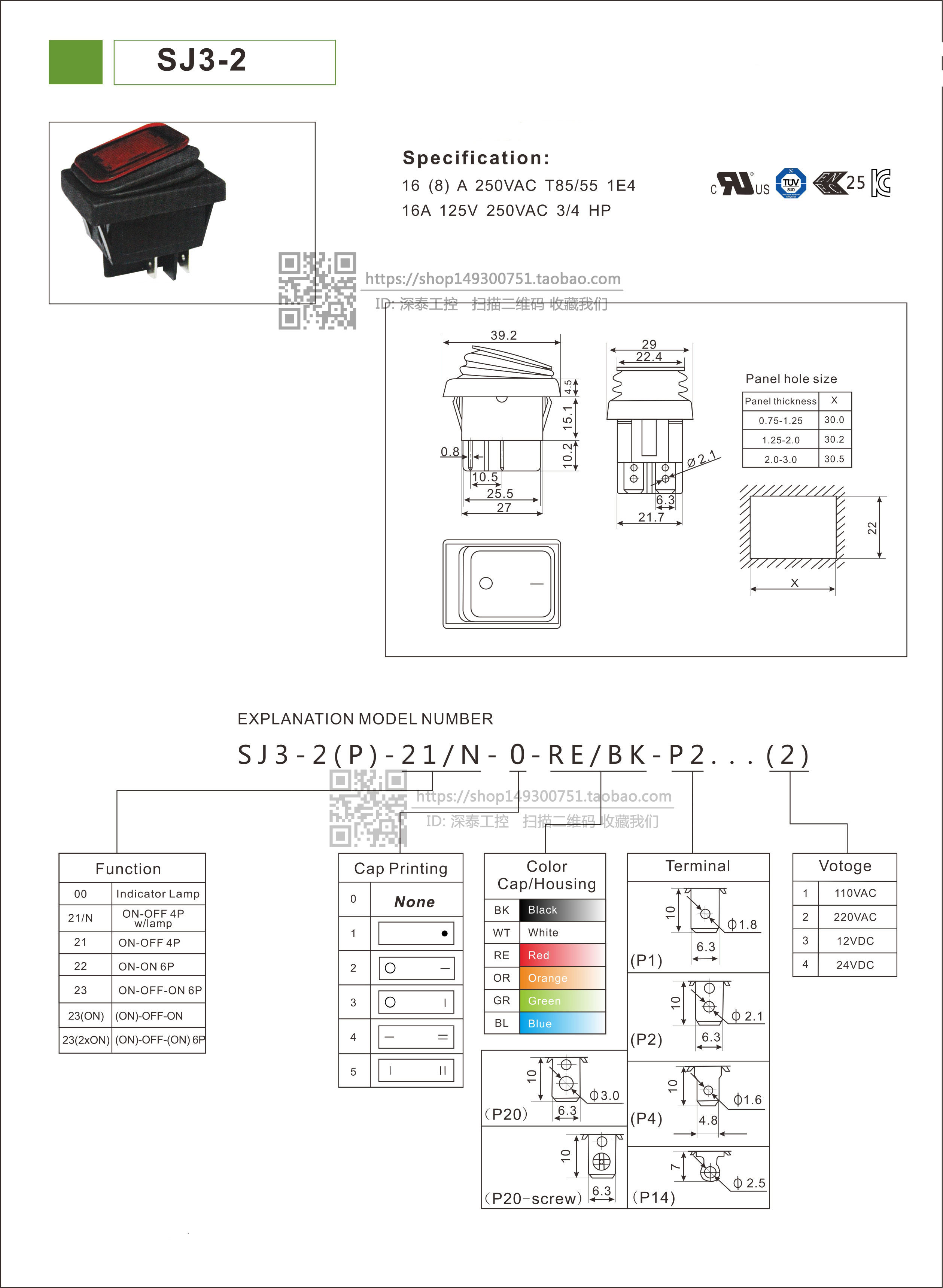 Imported waterproof and dust-proof rocker switch SJ3-2 red-green 4-foot 2nd gear with light four-pin rocker KCD4-2X1N