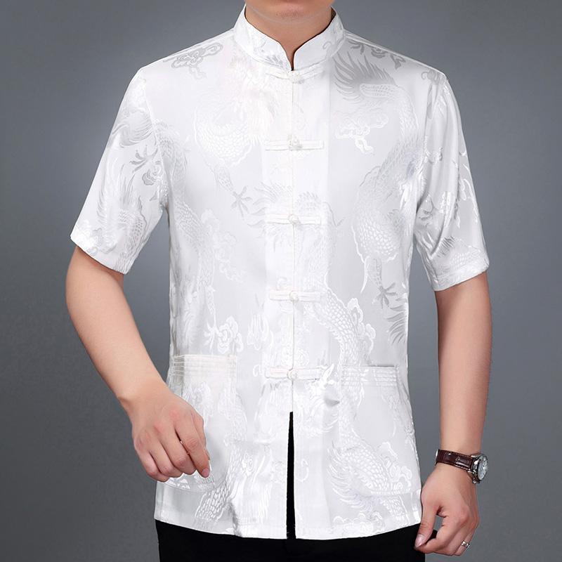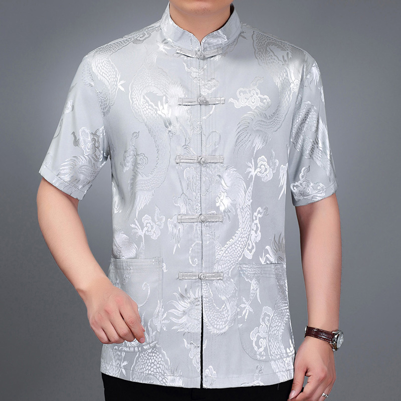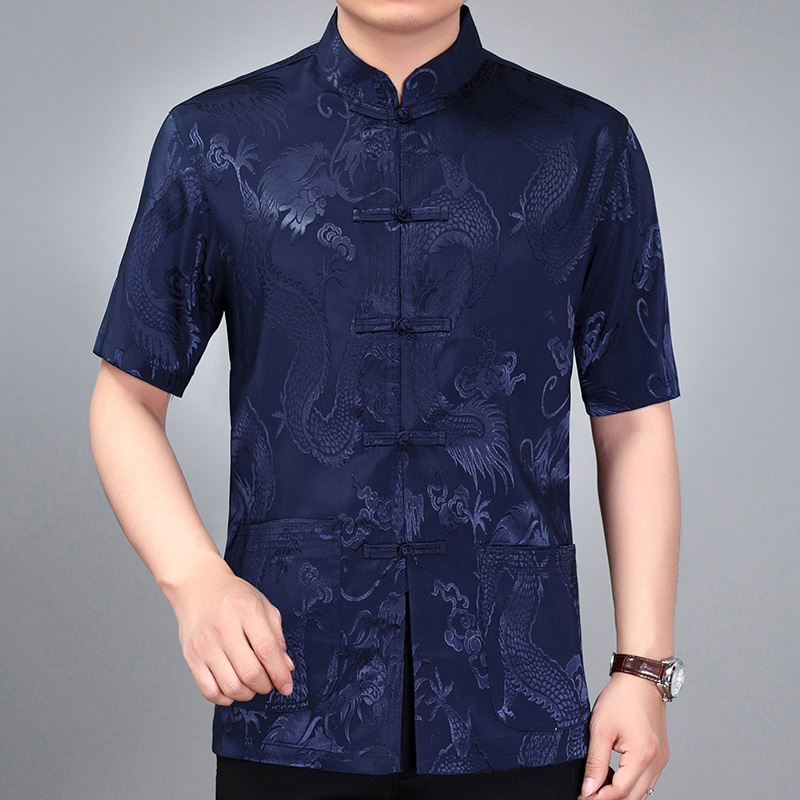 Middle-aged and elderly mulberry silk tangled short sleeve men's summer blouse Chinese style standout Han clothes for the elderly 50-60-70 clothes
