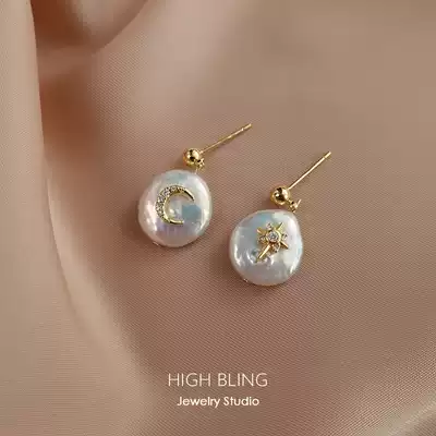 Natural Baroque pearl star moon earrings ear needles female 925 silver needle painless no pierced ears Mosquito coil ear clip