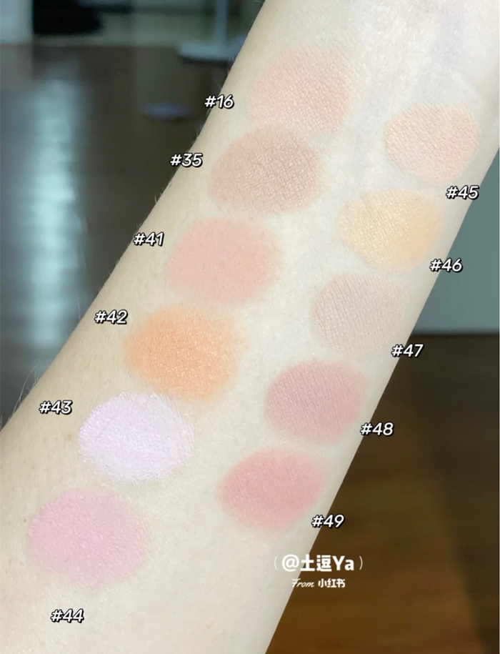 02 dead rose (matt) 04 cream orange (matte) 06 apricots color (matte with fine flash) 01 bean paste (matte with fine flash) 24 honey peach orange (matte) 35 baked milk tea (matte light)
