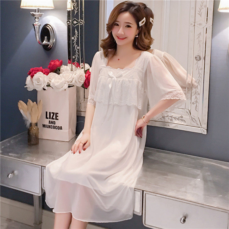 Fairy style pajamas nightdress female summer princess style short-sleeved cotton long version knee-length lace small sexy sweet and cute