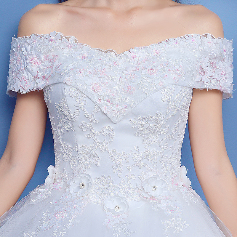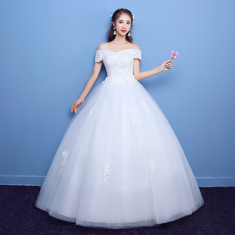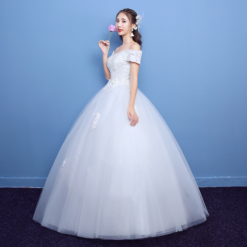 Dust Sees Six Heinees 2021 Summer New word Shoulders Korean Style Bride Wedding Dress Gown Lace Big Size Slim Wedding Dress