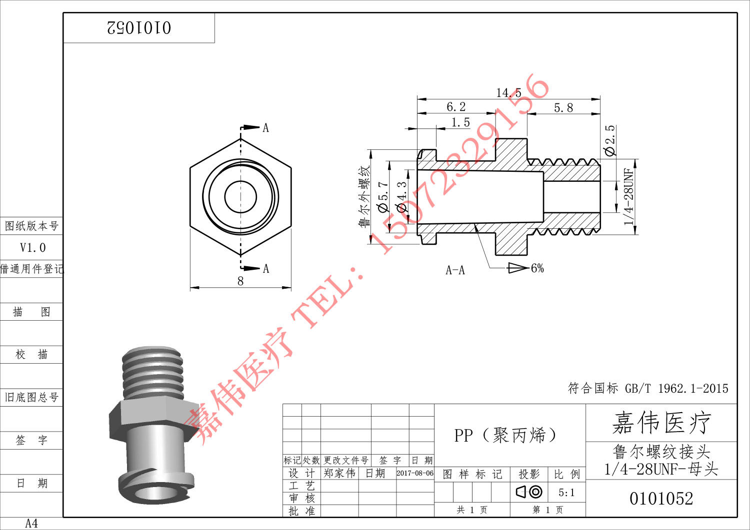 Ruhr threaded joint 1 4-28UNF medical scientific research with male plastic PP polypropylene straight through the Ruhr joint