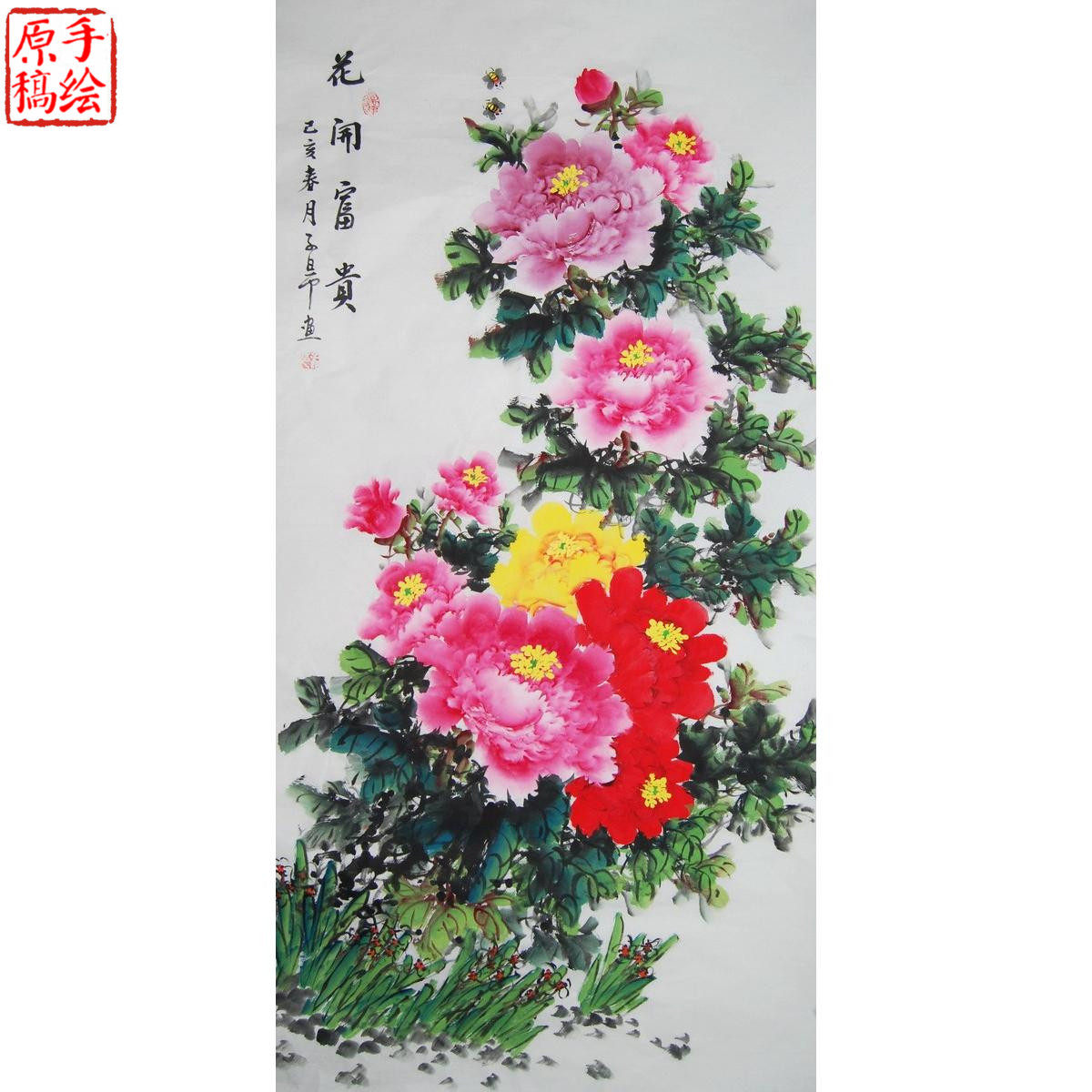 Special price pure hand-painted four-foot small six-foot Chinese painting Flowers and birds Living room Feng Shui painting Flowers and rich office decoration calligraphy and painting