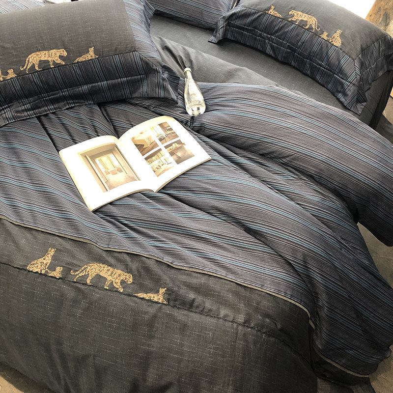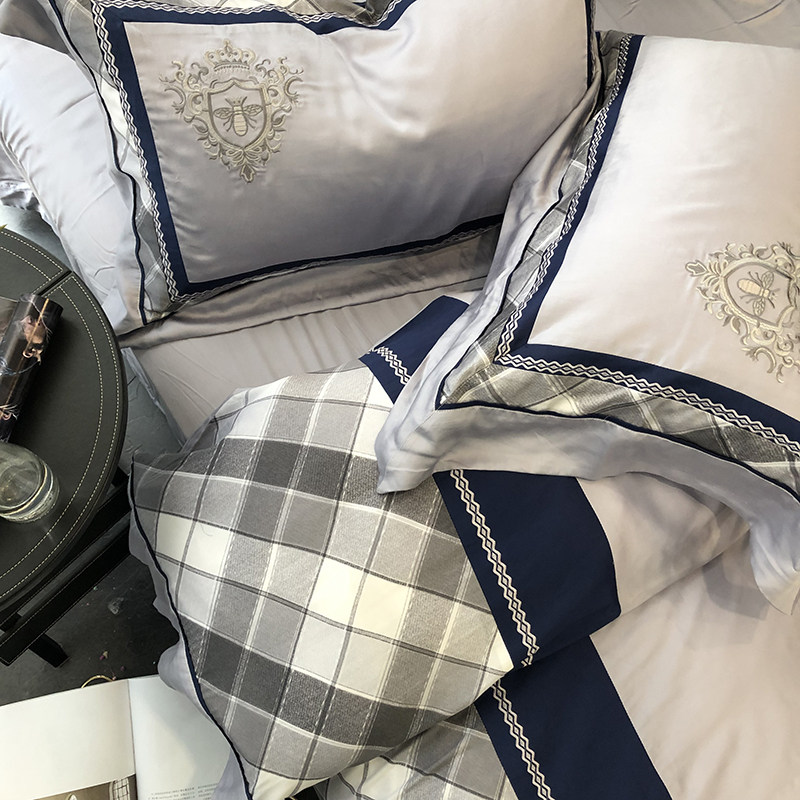 Embroidered stitching plaid 60 satin long-staple cotton four-piece suit men's business cotton sheets quilt bedding