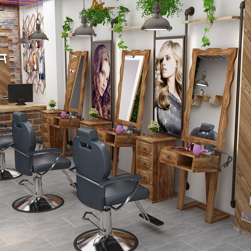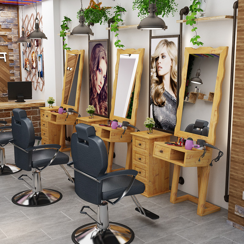 Hair mirror table Hair mirror table Single-sided hair salon mirror Retro old solid wood hair shop floor-to-ceiling double-sided mirror
