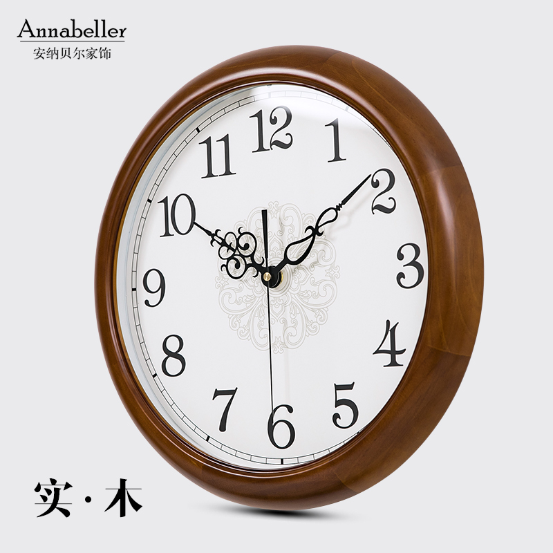 Simple solid wood wall clock living room dining room mute European round quartz clock new Chinese style household atmospheric clock