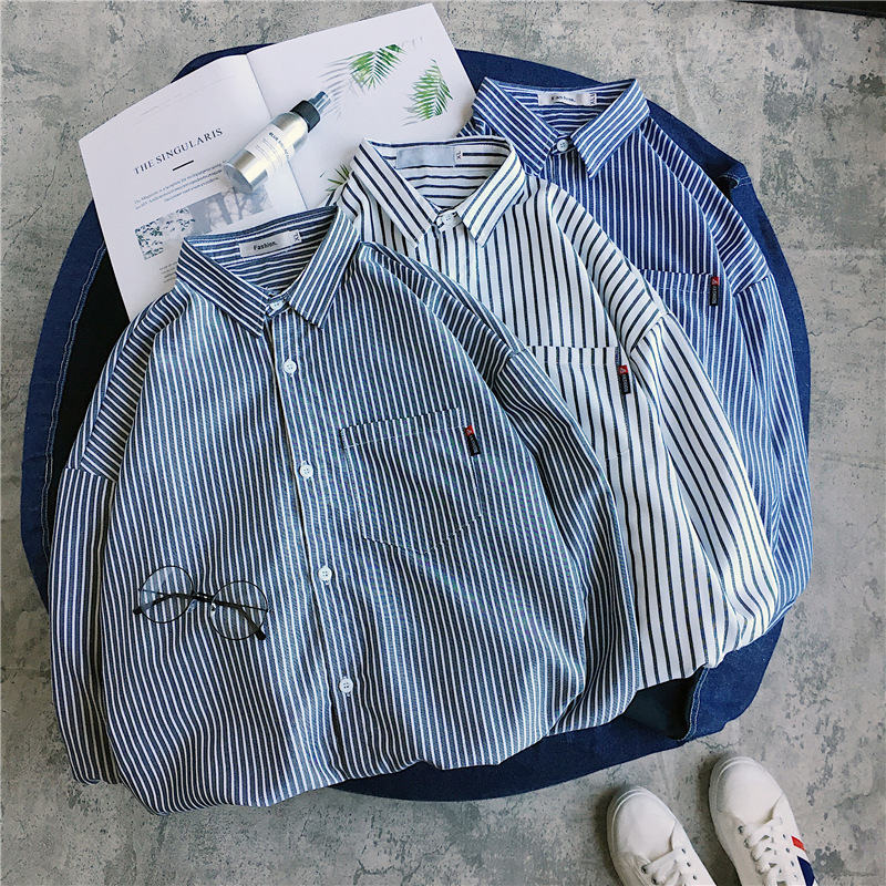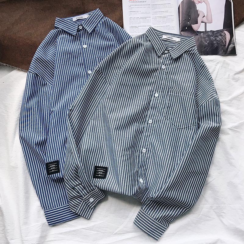 2021 summer new striped shirt men's long-sleeved jacket Japanese retro student literature and art Harajuku style loose shirt
