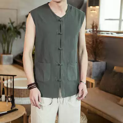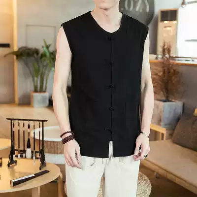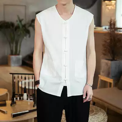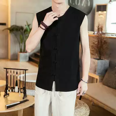 Chinese style Tang suit men's vest vest Chinese stand-up collar jacket buckle Kung fu shirt Retro sleeveless T-shirt summer