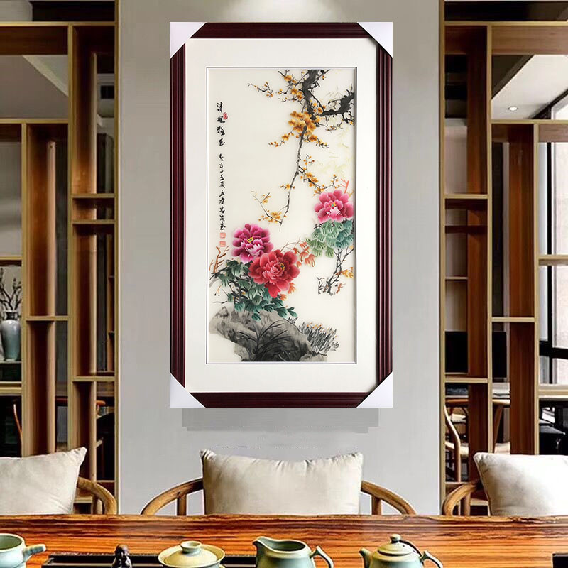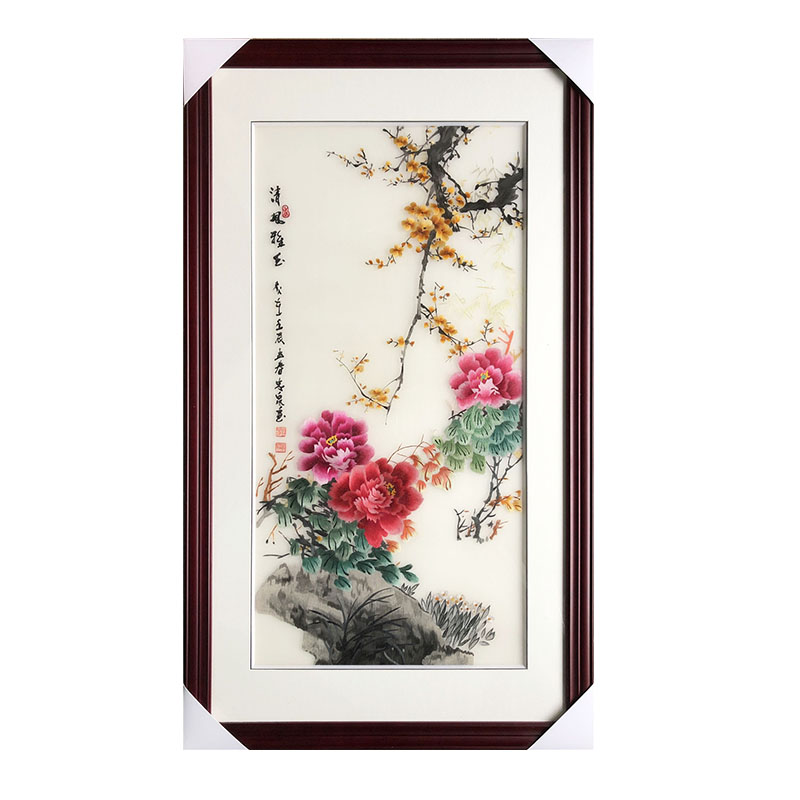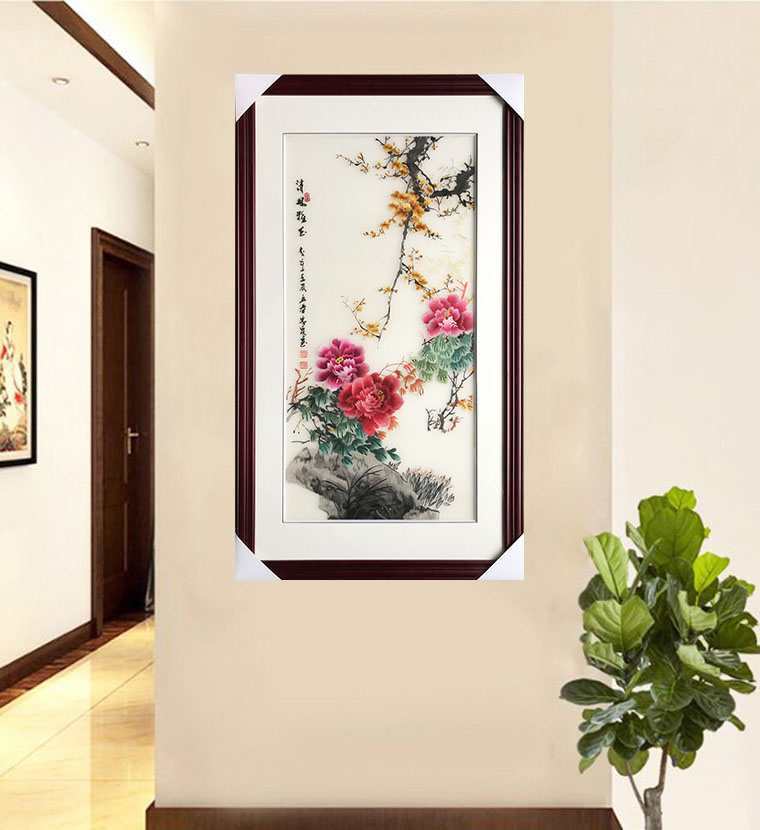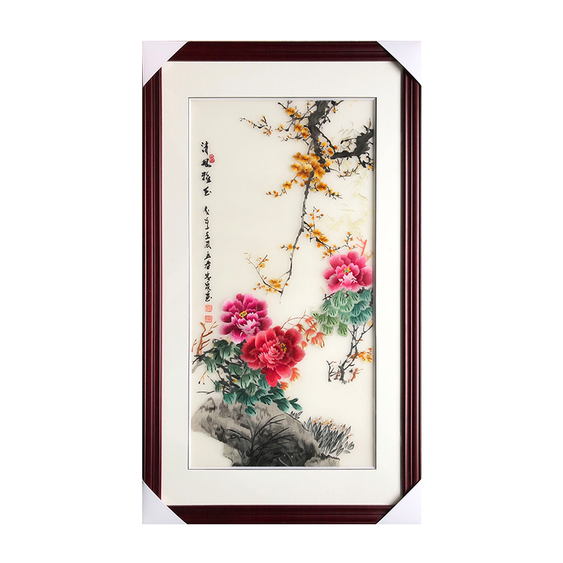 Suzhou embroidery finished painting pure hand-made basalt study room decoration corridor silk peony flower vertical