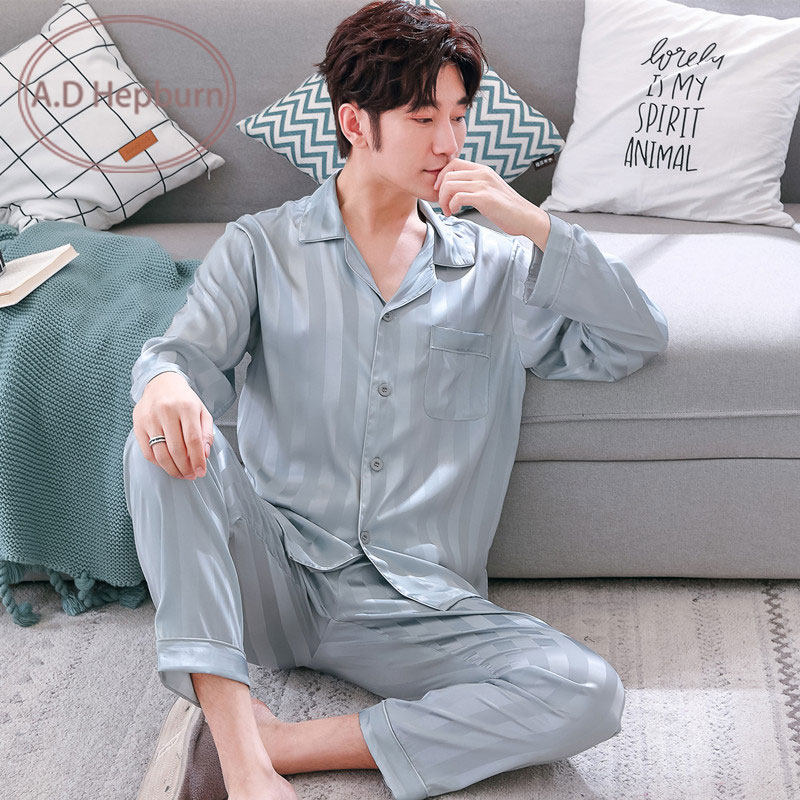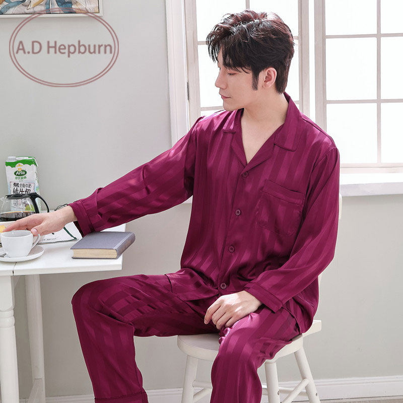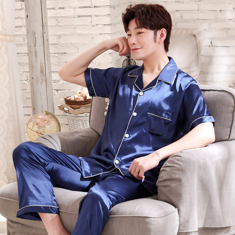 Silk pajamas men's summer ice silk spring and autumn long-sleeved middle-aged dad suit men's summer thin silk home clothes