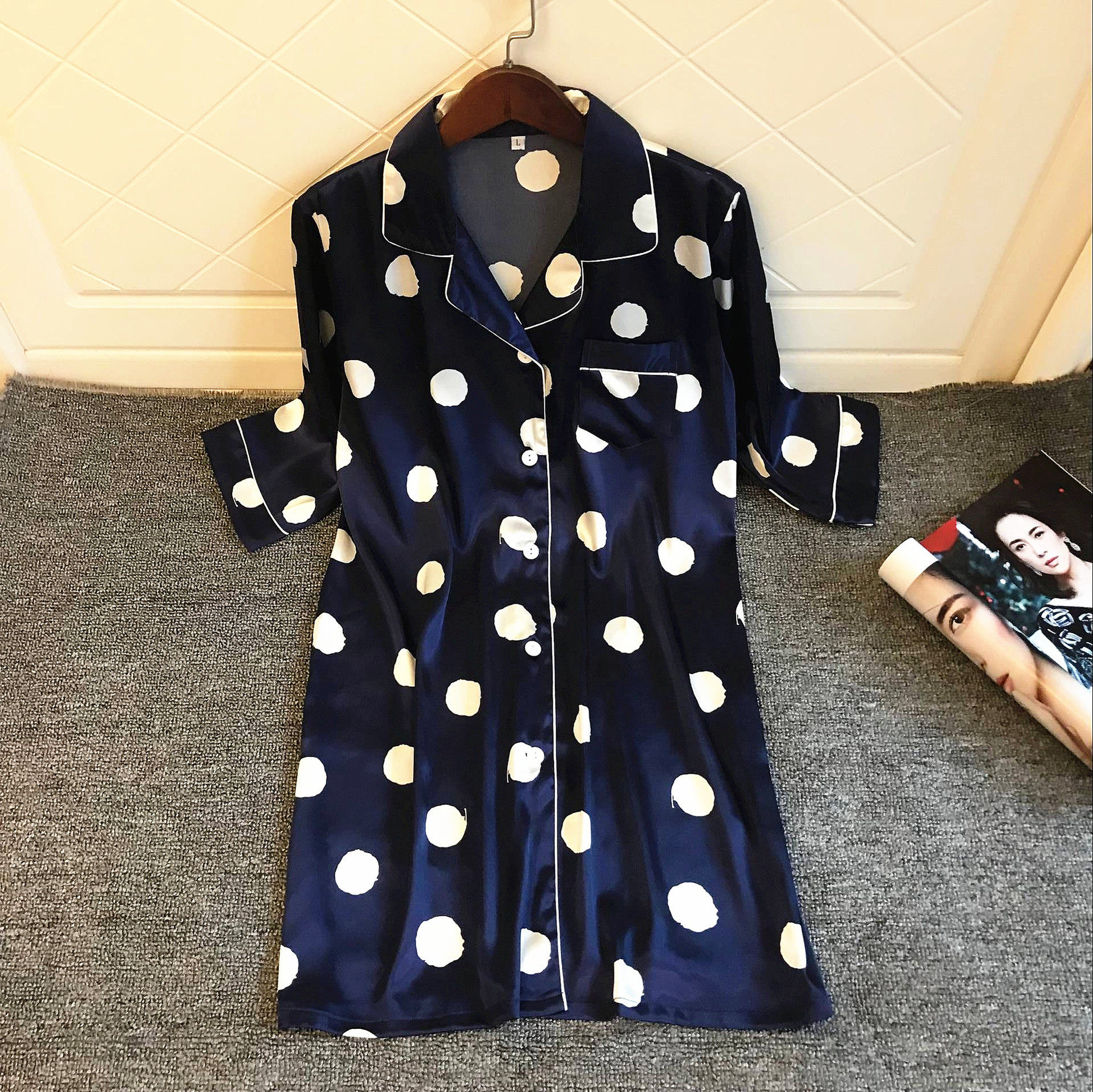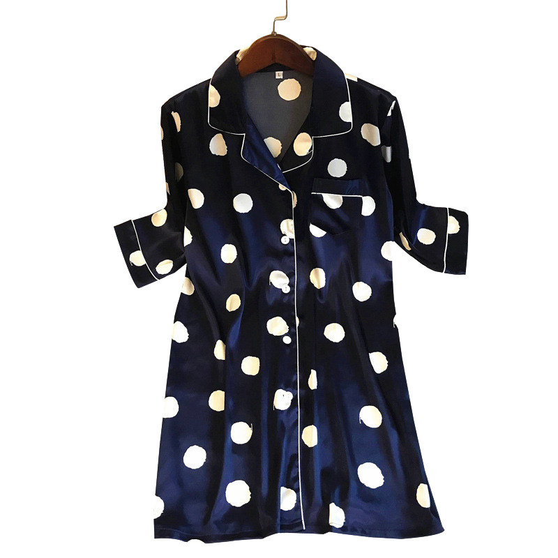 White polka dot shirt sexy pajamas women's summer mid-length nightdress sweet and cute ice silk cardigan with thin sleeves