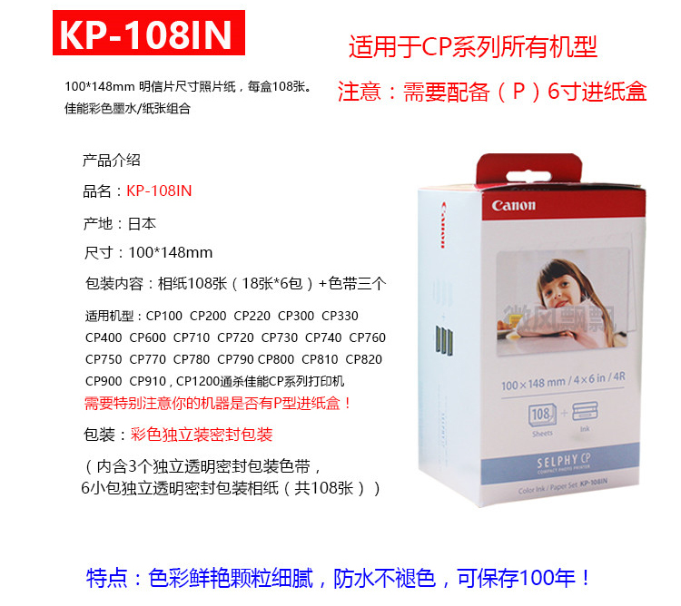 Canon KP-108IN6 inch Thermal sublimation photo paper KP108IN photo printer photo paper CP1200 1300