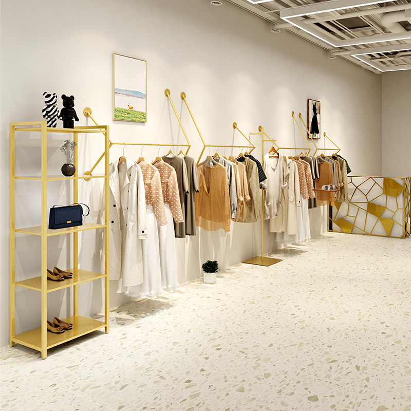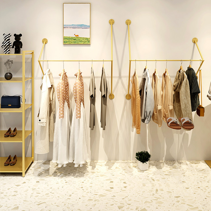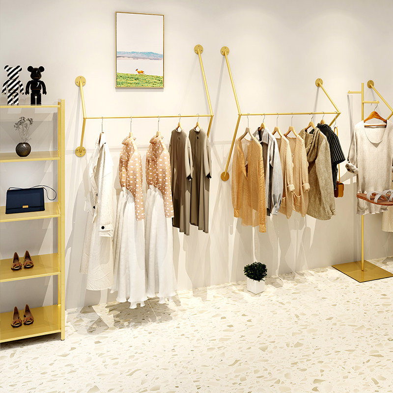 Gold clothing store display rack on the wall side hanging wall-mounted women's store clothing rack shelves Clothes rack hangers