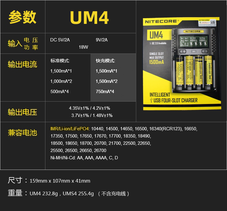 NITECORE Knight Kohl UMS4 UM4 QC Quick charge 18650 Smart temperature-controlled protection USB charger