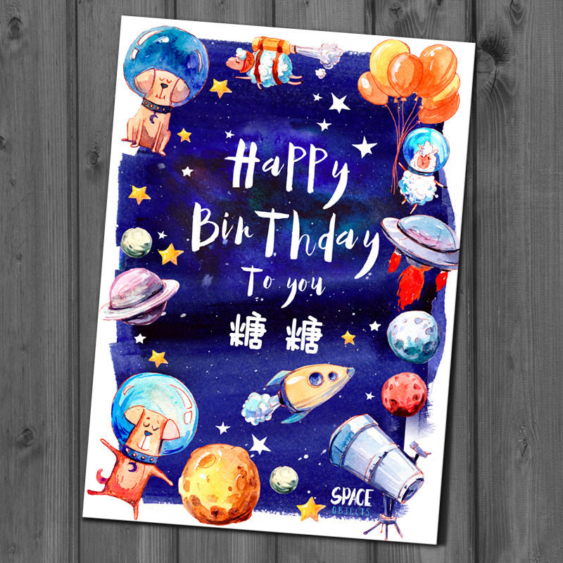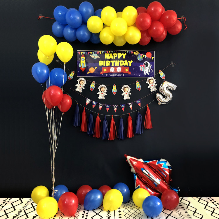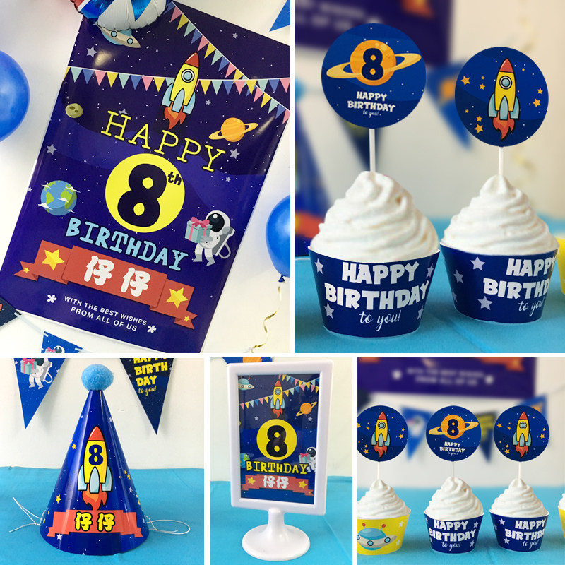 Wall decoration A set of birthday hats (name and number please note)Custom table cards A cake card 5 space posters 55x75cm posters A 55x75cm mini pennant big plane