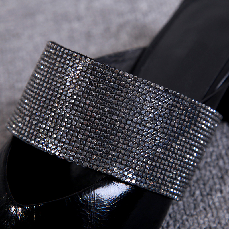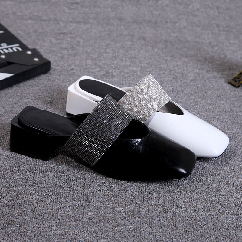 European and American 2022 Summer new genuine leather coarse and lazy person Baotou Female slippers Water drill square head outer wearing with half slippers