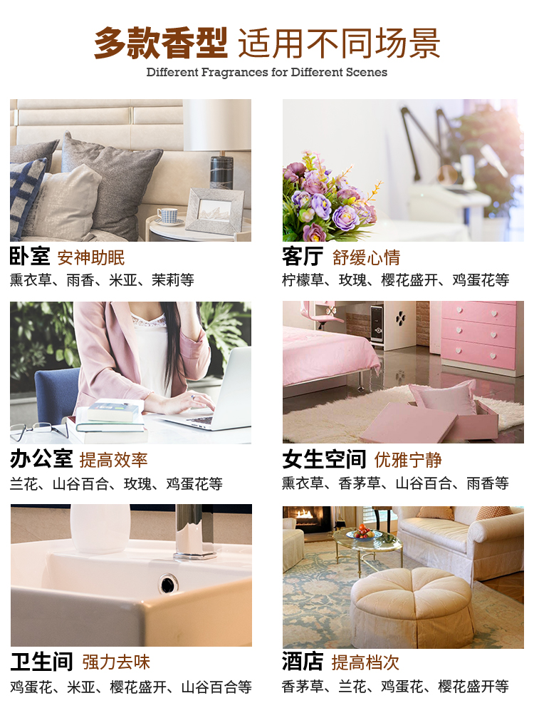 Lavender (calming to sleep with sleep) lemon grass (refreshing brain) jasmine (lifting confidence) Valleys Lilies (Pleasant Mood) Orchid (Lifting Efficiency) Rose Aroma (Aphrosary Pleasure)
