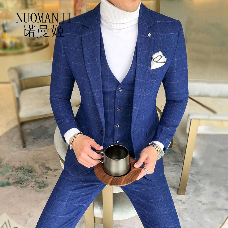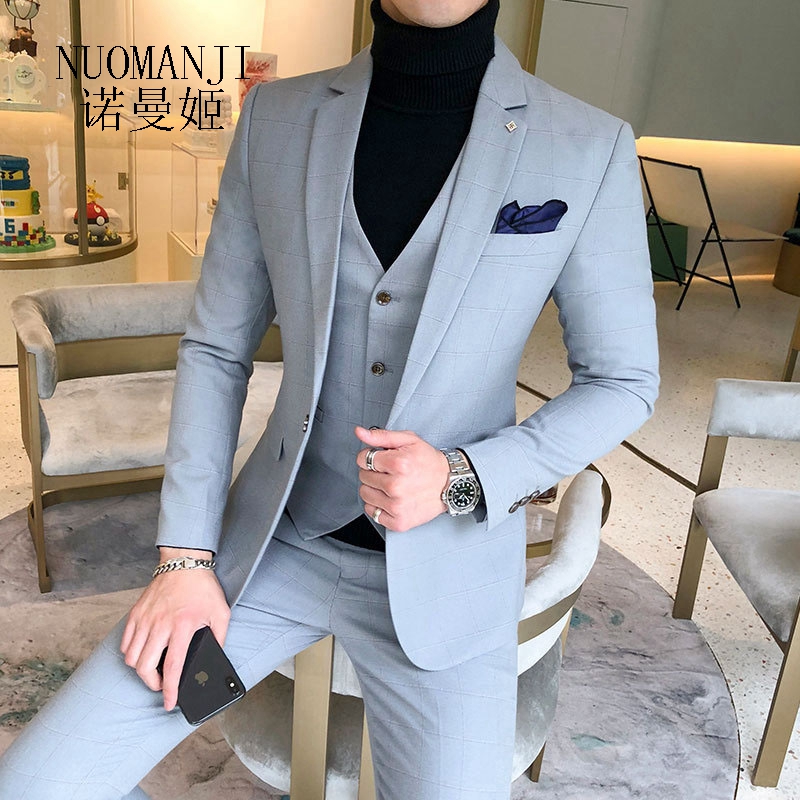 Norman Ji high-end men's plaid suit all-match simple personality trend business groom suit three-piece suit
