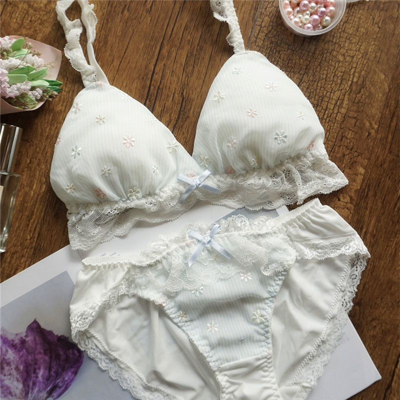 Sweet ~ This New Year's Eve Cute Striped Embroidery Sleep Lingerie Triangle Cup no steel ring Female lingerie suit