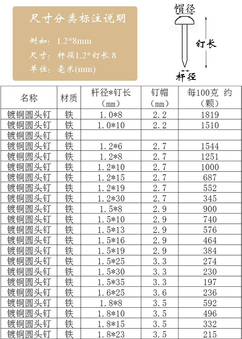 Copper plated small iron nail round head small screw copper sleeve copper foot sleeve special round head nail small copper nail