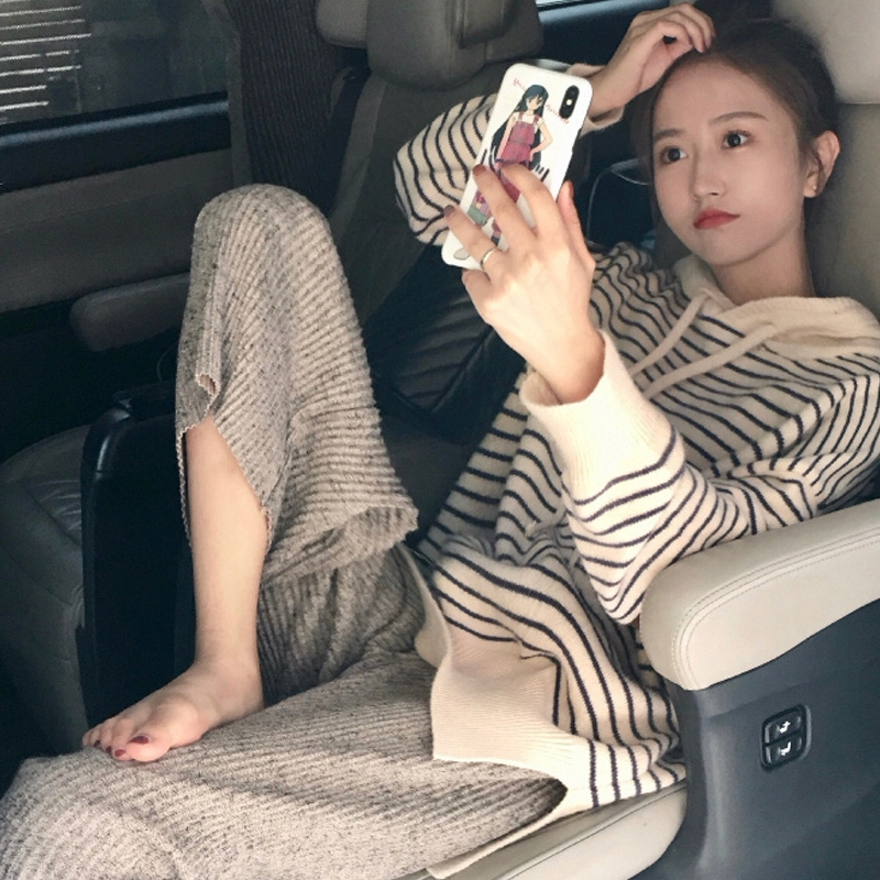 Black trousers, salt style, gentle style, autumn clothes, gray pants, salt style, clothes, gentle style, autumn clothes, gray striped top, gray pants suit, salt style, gentle