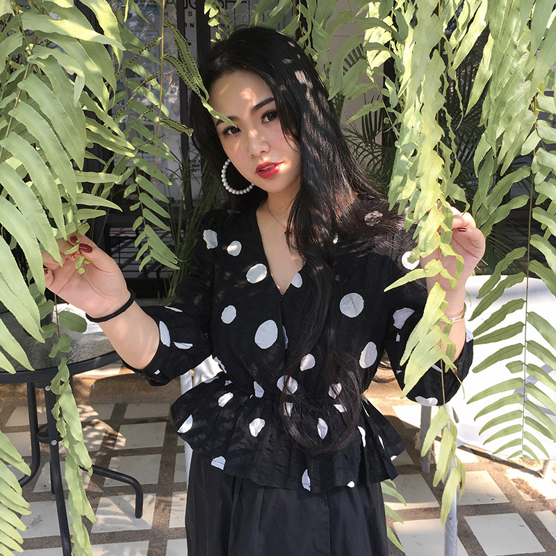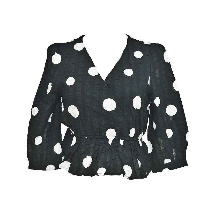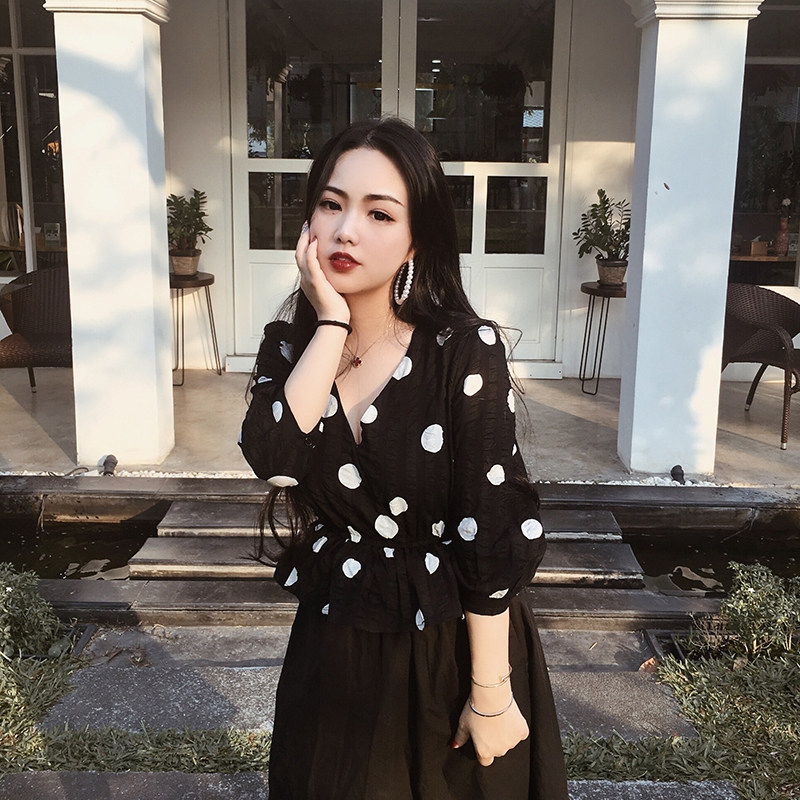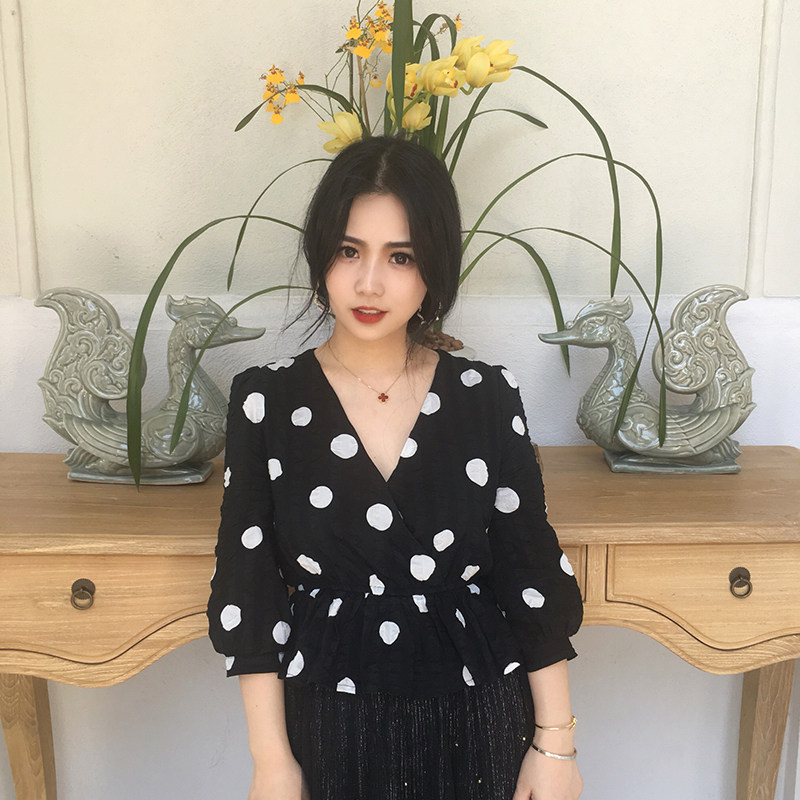 Free small size black and white polka dot retro three-quarter sleeve top cross V-neck elastic waist thin shirt small 150