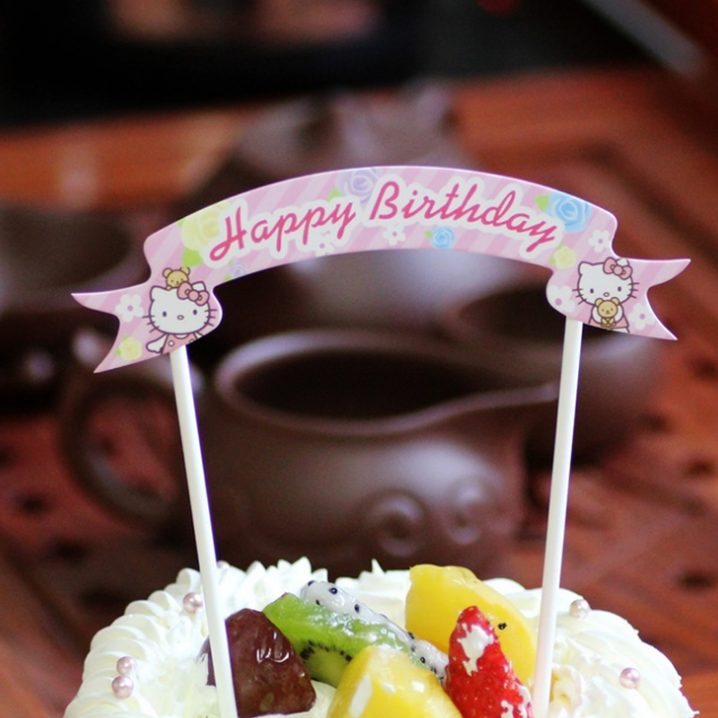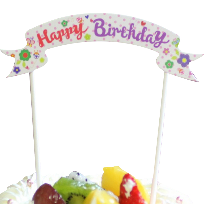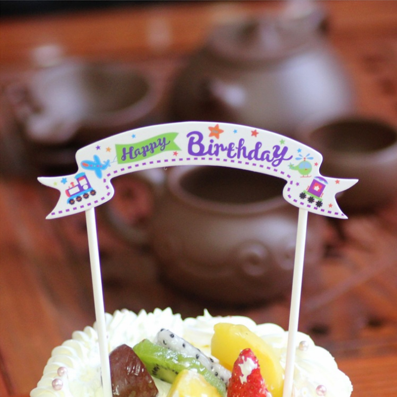 Birthday cake decorated with two pointed flowers, train inserts, happy birthday, flags, happybirthday