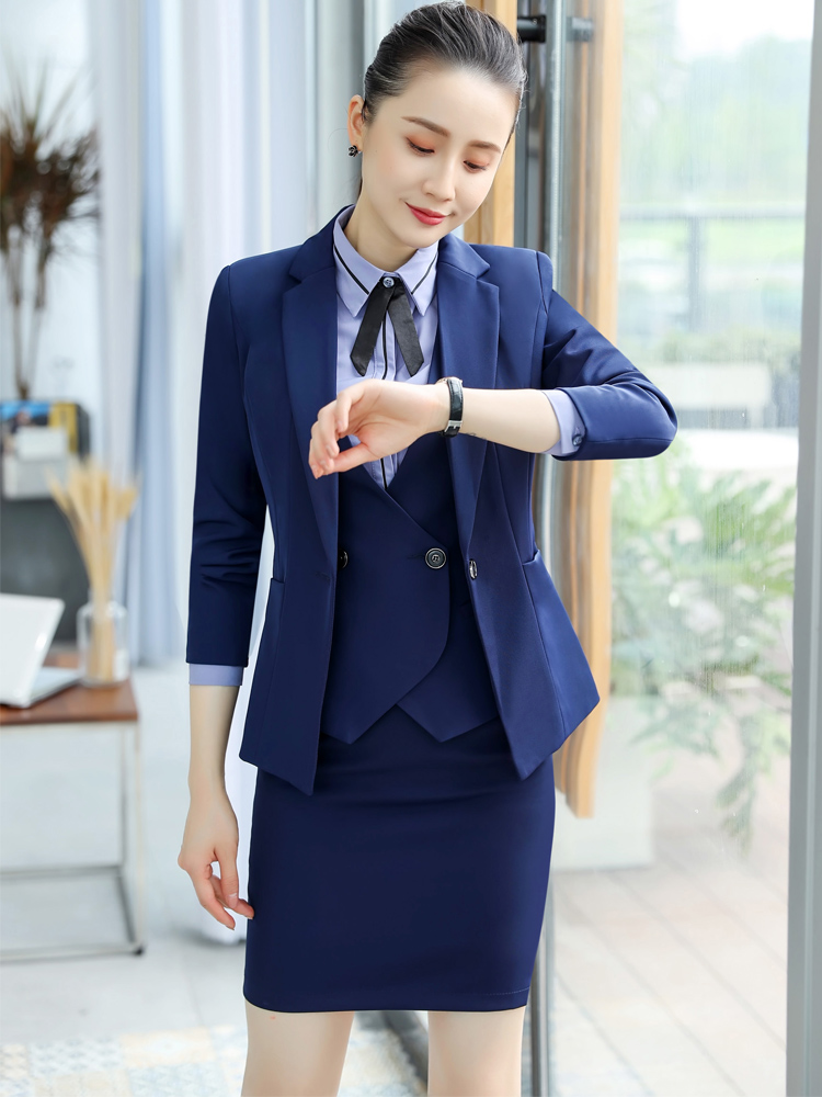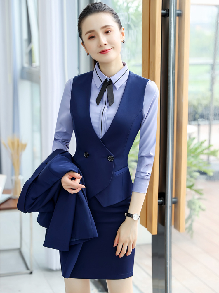 Blue vest, blue long shirt, blue skirt, blue jacket, blue long shirt, blue skirt, blue jacket, blue long shirt, blue pants, blue jacket, blue skirt, blue jacket, blue pants, blue jacket, vest, blue lining