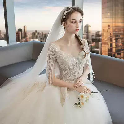 One-word shoulder main wedding dress 2021 new bride temperament Mori starry sky big tail Super fairy dream little luxury