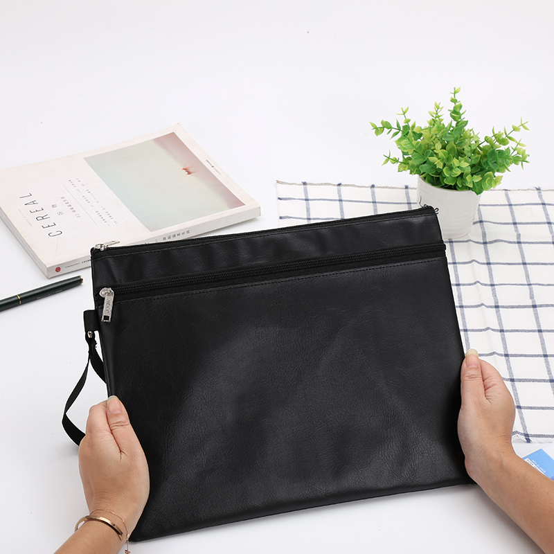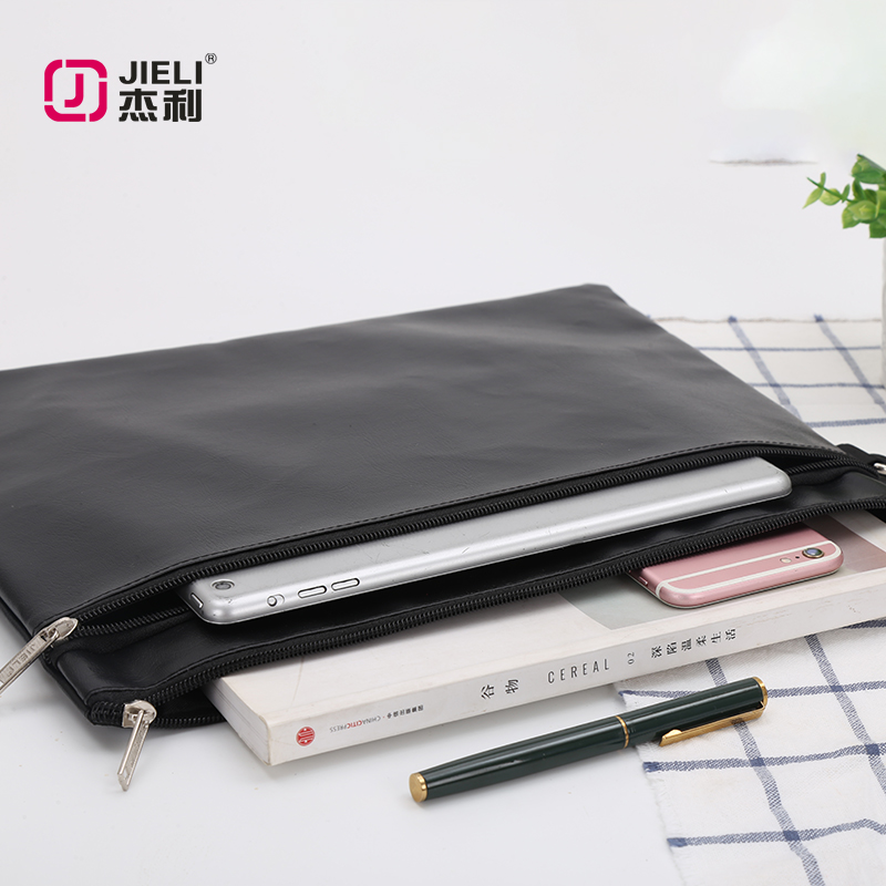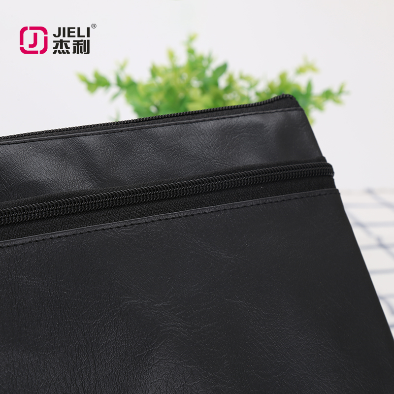 Jerry leather file bag A4 portable zipper bag office supplies ticket bag A5 side carry hand bag PU double leather information bag bronzing LOGO custom conference promotion storage bag black