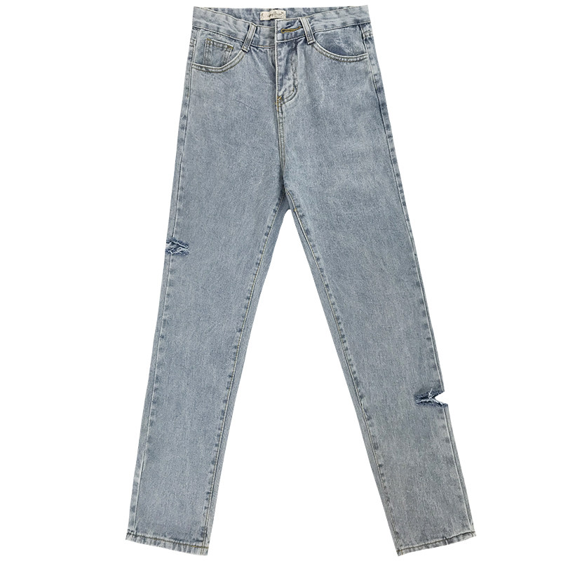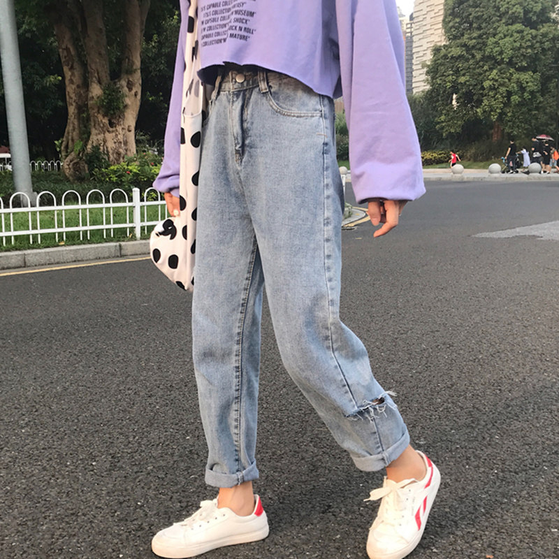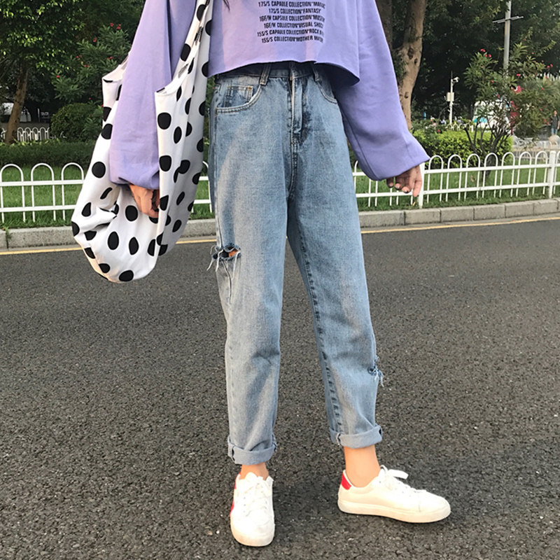 Big size ripped jeans female fat mm pants loose thin high waist bf style student wide leg straight nine-point pants tide