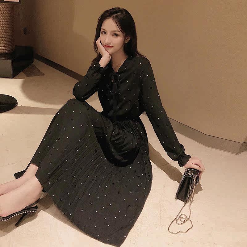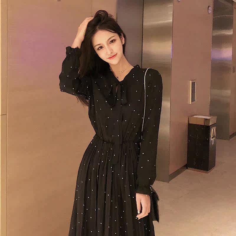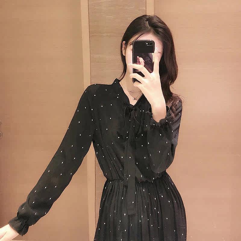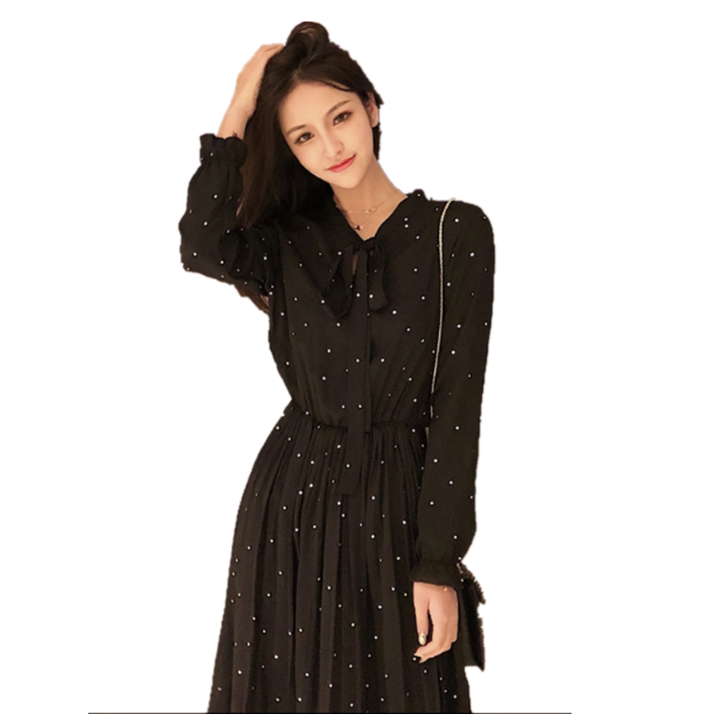2022 spring new large-size long-sleeved printed polka-dot chiffon dress with bow waist pleated skirt long skirt