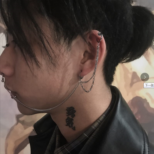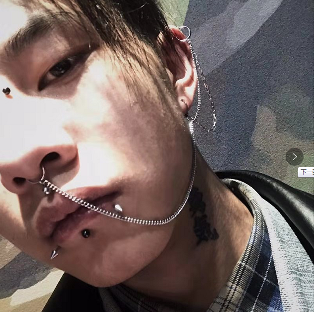 Double ear piercing, chain nose clip, double ear piercing, chain lip nail, one ear hole, one ear clip, chain nose clip, one ear hole, one ear clip, chain lip nail, single ear hole, chain nose clip, single ear hole, chain lip nail