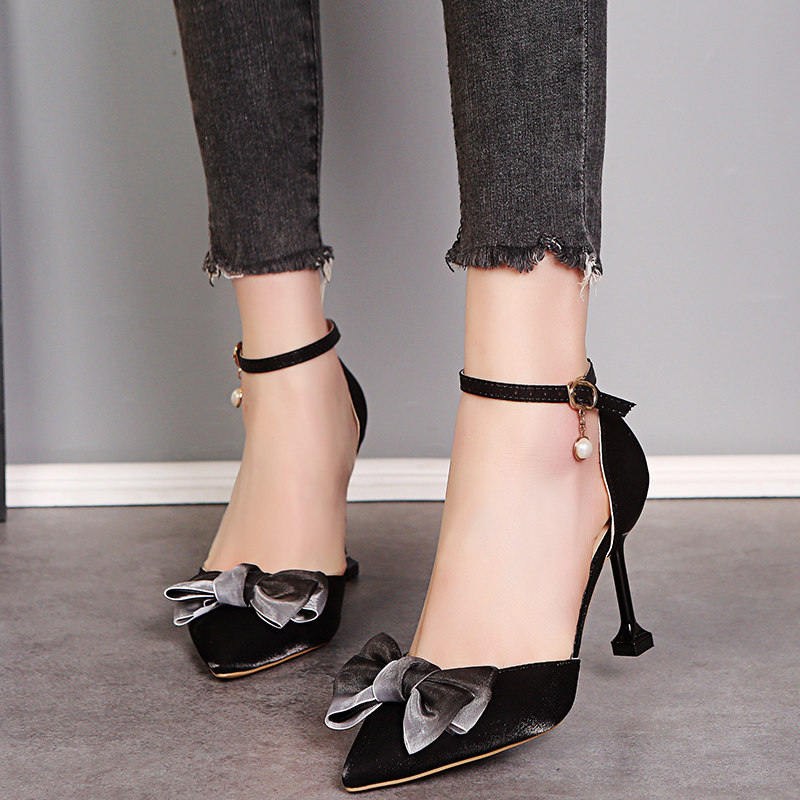 2021 new silk satin butterfly knot women's single shoe fine heel pointed high heel shoes with sandals red wedding shoes boomer shoes