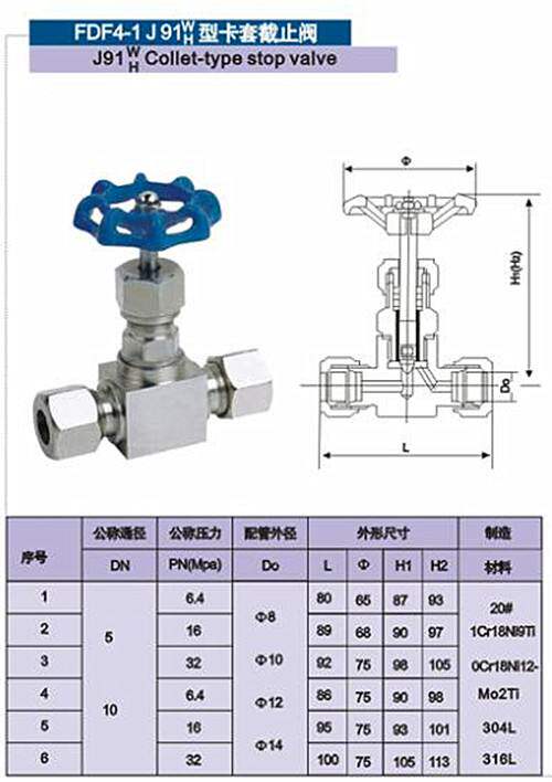 304 stainless steel cutting sleeve type needle type valve JJY1-160P J91W-160P clamping high-pressure needle type stop valve