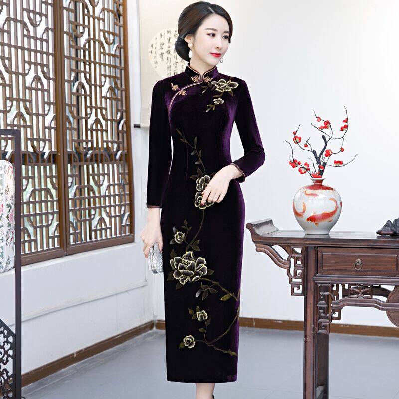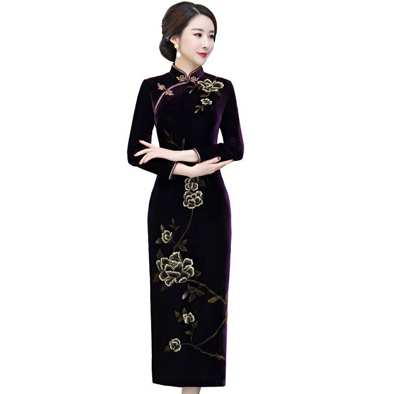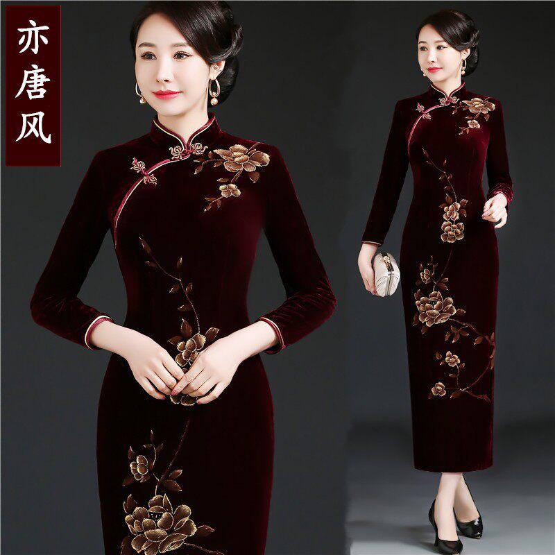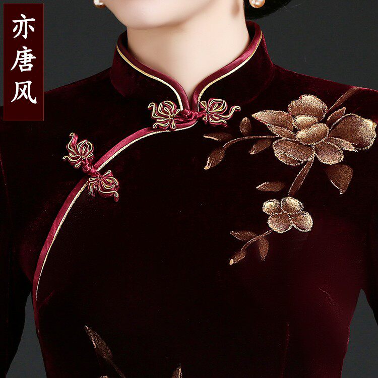 Large Size Code Long Sleeve Golden Velvet Qipao Long Version Elegant China Wind Wedding Gift Mother Dress Gown Dress Lady Spring Autumn