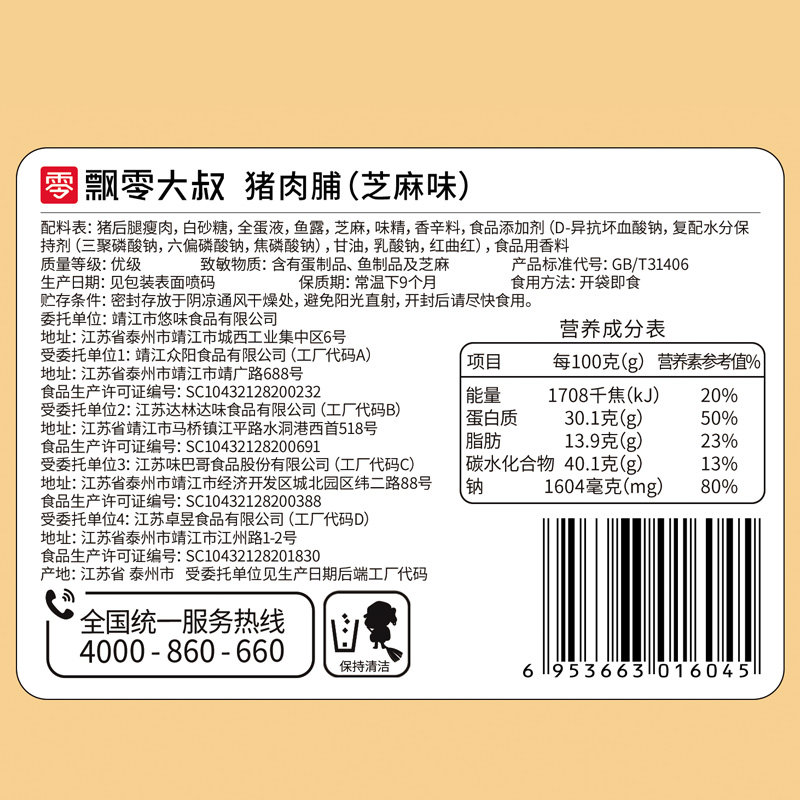 Sesame pork preserved 50g sausage 80g money 56g shredded pork 50g