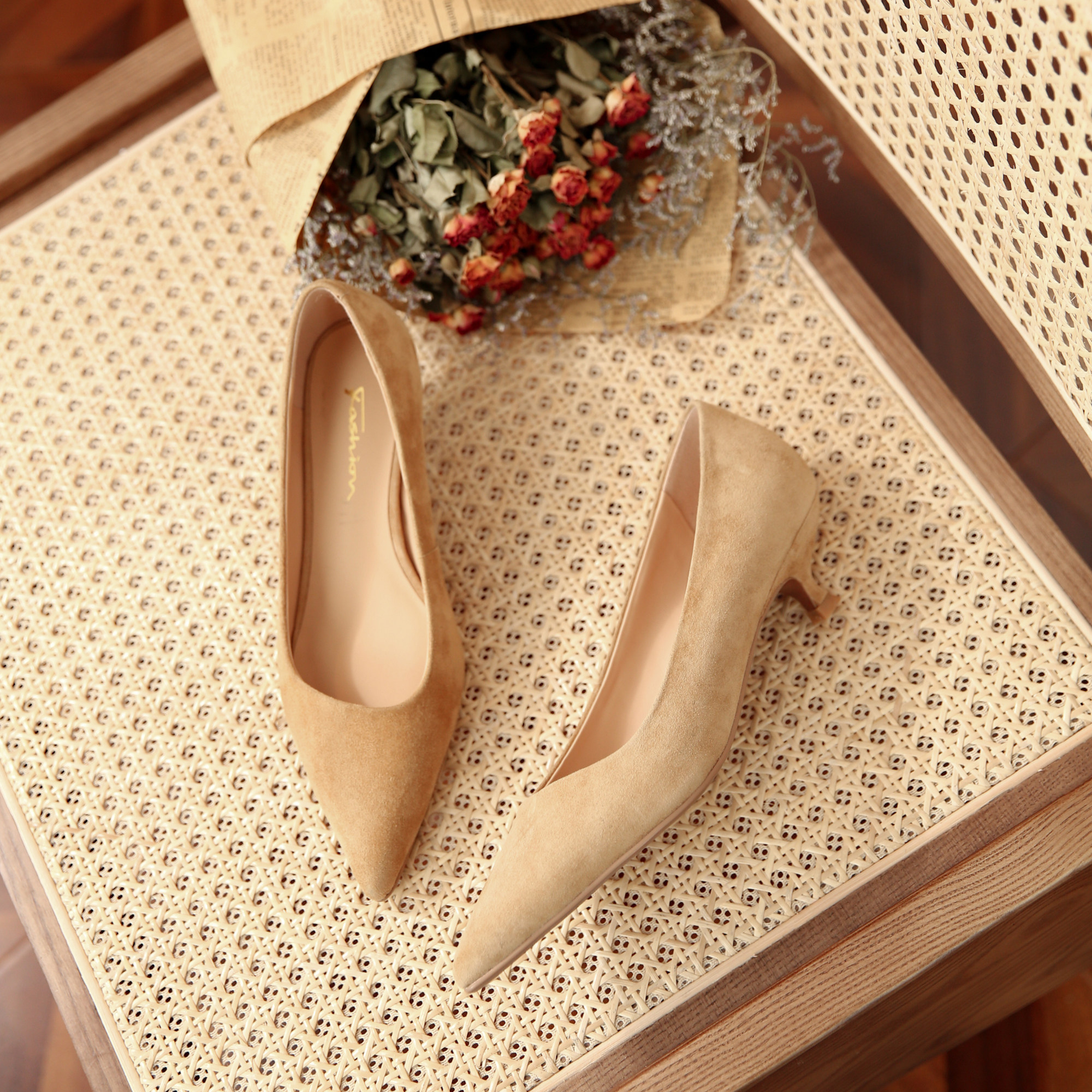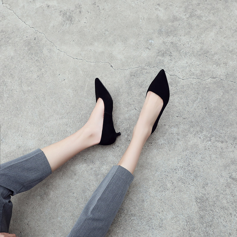 Single shoe woman 2022 Spring paragraph Tip Shallow Mouth 3cm Low heel Heel Genuine Leather Cat Heel shoes apricot 100 hitch heel shoes