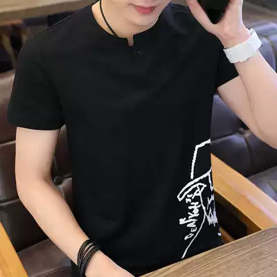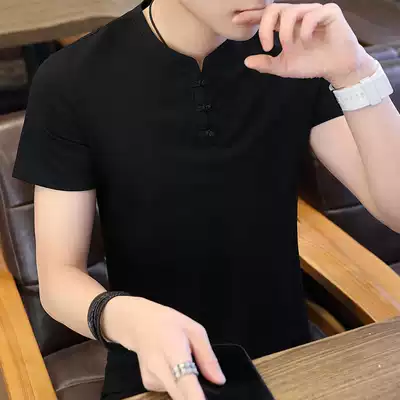 Linen short-sleeved men's collars top Chinese style men's summer 2020 fashion slim thin vneck cotton linen T-shirt dx