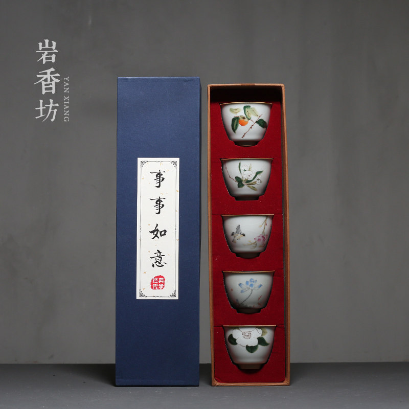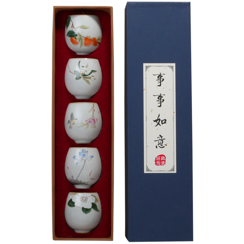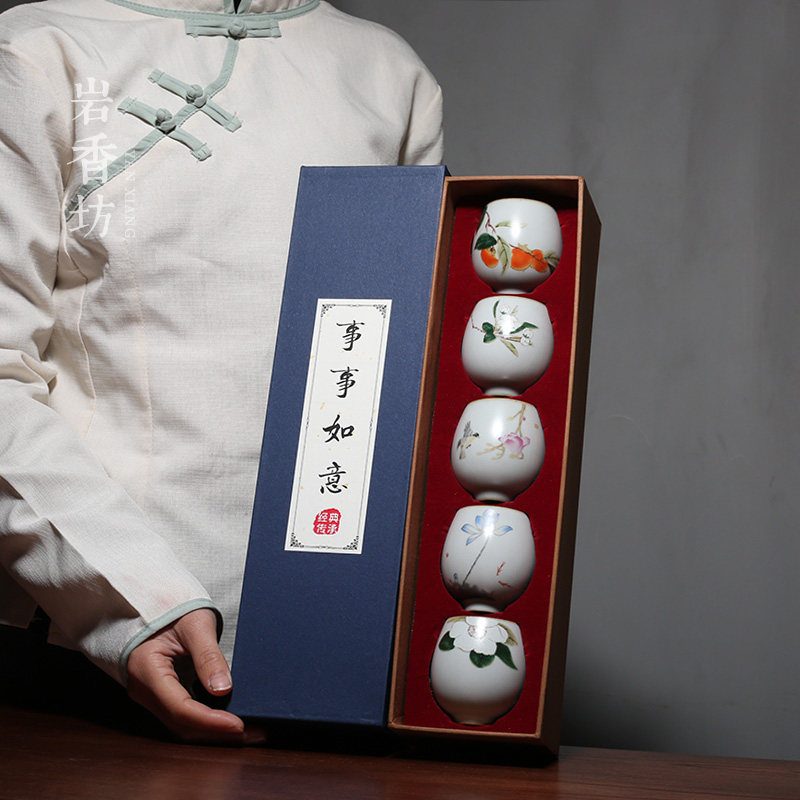The moon white ru kiln round teacup five sets of moon white ru kiln exposed cup five sets