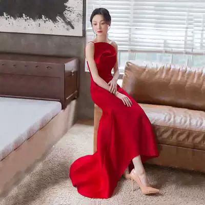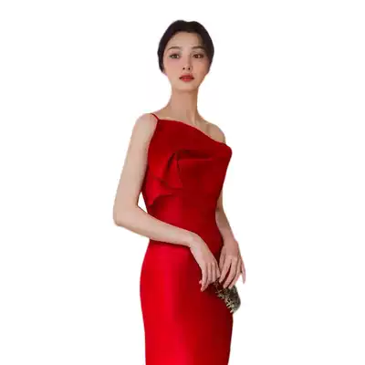 Red suspender toast dress bride 2021 new summer slim slim long version banquet host evening dress female